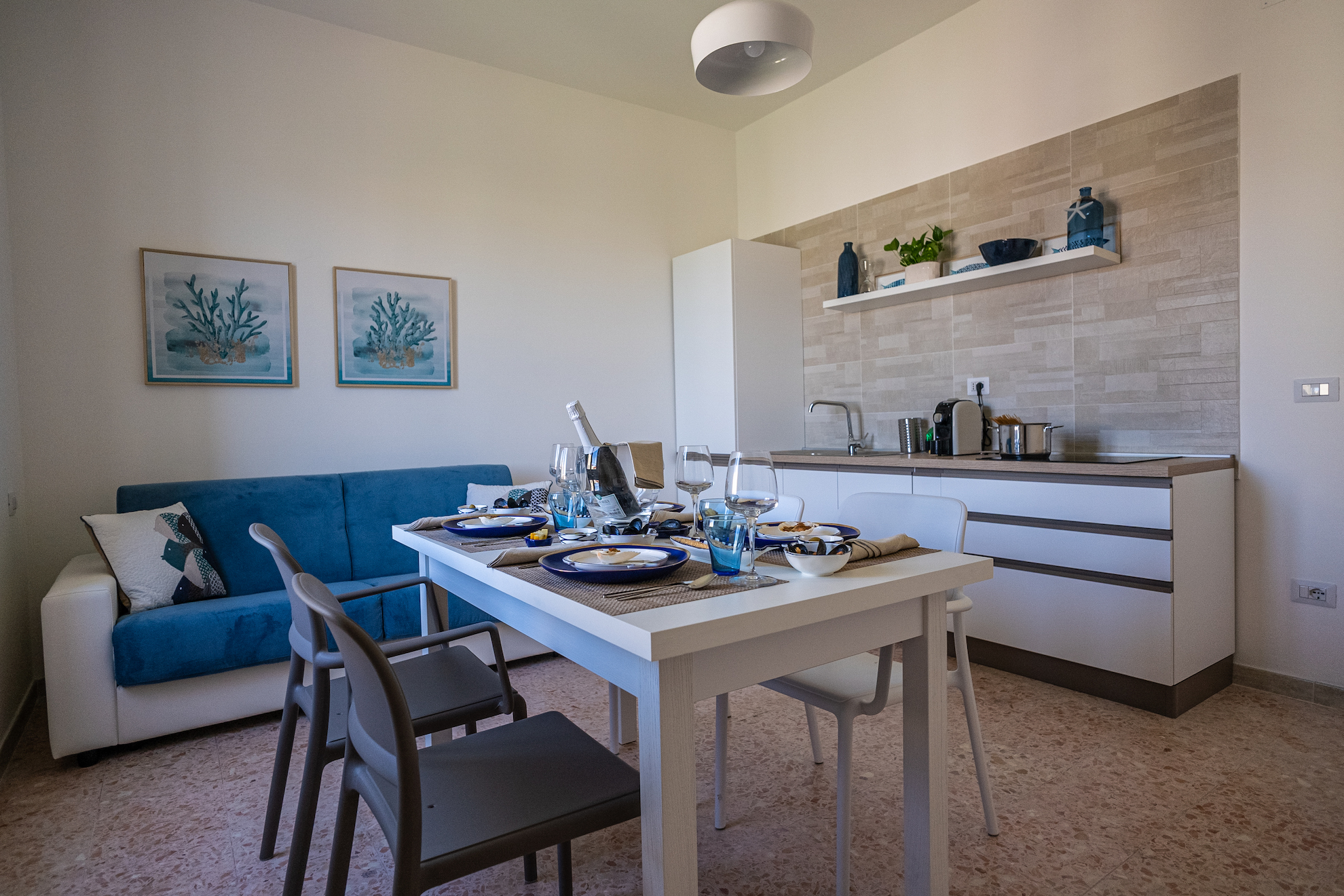 Dettagli raffinati dai colori tenui ispirati ai panorami di Alghero per donare all’ambiente un tocco di serenità